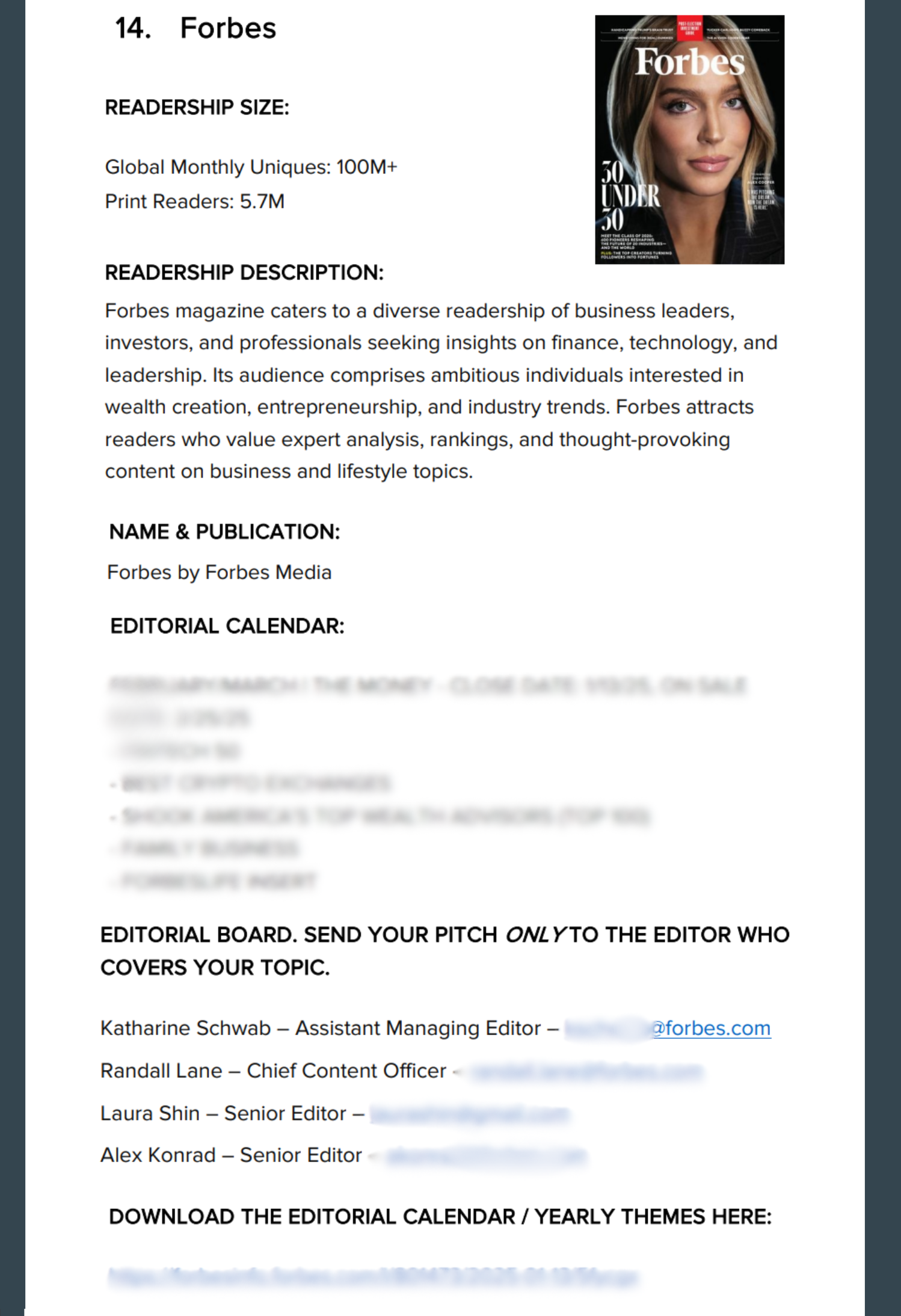 That’s where this comes in: 100+ magazine editors’ contact information along with their editorial calendars from top national publications. It’s your inside track to what editors are covering and when, so you can pitch with confidence.